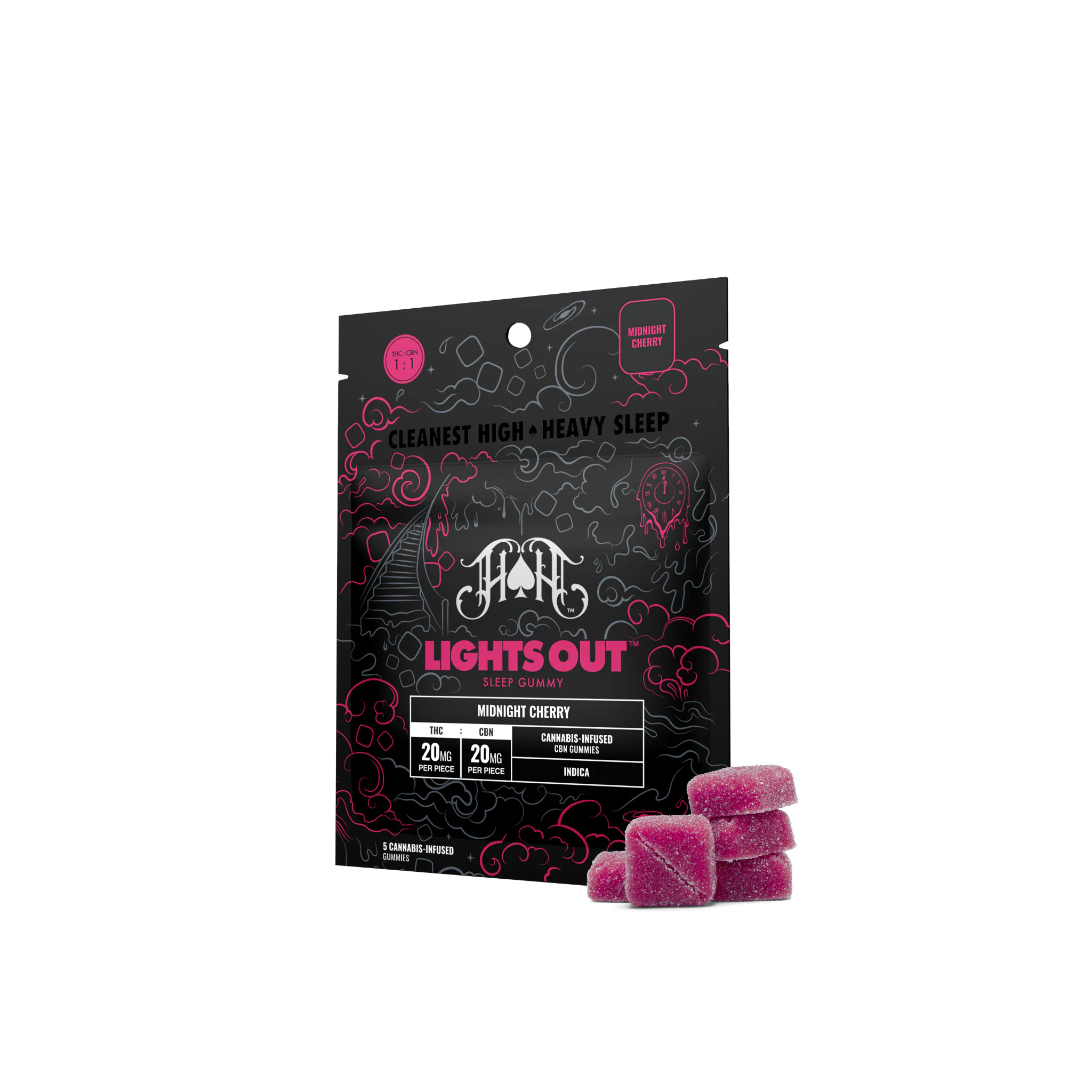 The ultimate knockout. Providing full-body relaxation and mental calmness, Lights Out CBN Sleep gummies put you down gently and keep you asleep throughout the night. A smooth blend of cherry and dark fruit flavors, these gummies are infused with a 1:1 ratio of Heavy Hitters Ultra Extract and pure CBN. CBN, a rare cannabinoid created when THC is exposed to oxygen and light, is famous for its sedative properties. When paired with THC, CBN may provide a better night's rest. 20mg THC | 20mg CBN per piece. Gluten free. Dairy free. Nut free. Using a powerful combination of THC and CBN delivered by the velvety flavor of black cherries, Lights Out Midnight Cherry is the undisputed Heavyweight Champion of night-time confections, pummeling you with right hooks of heavy relaxation and always winning with a stunning KO. Strain Type: Indica Flavor: Sweet and velvety midnight cherry Terpene Blend: Myrcene, Caryophyllene, Humulene