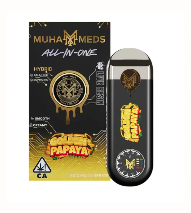 Golden Papaya by Muha Meds offers a tropical-inspired vaping experience in a convenient 1g All-In-One (AIO) format. Known for its sweet, juicy papaya flavor accented by subtle citrus and herbal undertones, this strain delivers smooth, flavorful draws while preserving the full terpene and cannabinoid profile. The AIO design is sleek, portable, and ready to use, making it an easy choice for consumers seeking a reliable, on-the-go vape.