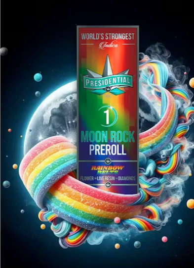 Your Presidential Moon Rock Preroll consists of Indoor Craft Cannabis. The cannabis is then INFUSED with premium Liquid Live Resin, using Presidential’s proprietary infusion process that enables us to permeate the flower to the stem. Finally, it is coated in the highest quality Diamonds, creating the slowest burning, most potent Moon Rocks on the market! Our prerolls are ground and rolled for your enjoyment!